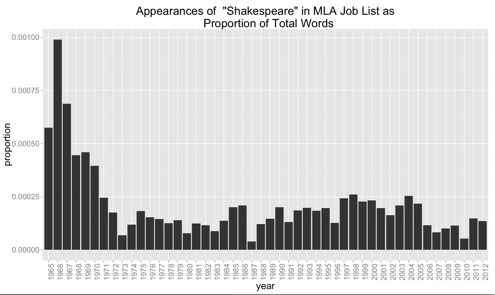 Around last year at this time, I became interested in what the archived editions of the MLA Job Information List could tell us about how the profession has changed over time. The MLA provided page-scans of all the JILs going back to 1965, and Jim Ridolfo used commercial OCR software to make them searchable. Once the documents were searchable, finding the first occurrence of various key words and graphing their frequency over time became feasible. One detail that became clear to me as I read each single issue of the JIL was that the formats differed enough to make graphs of relative frequencies somewhat misleading. Some of the editions are three times the size of others, and even normalizing over years doesn’t necessarily help here. So this image, for example, of the relative frequency of “shakespeare” in the JIL, needs additional interpretation: